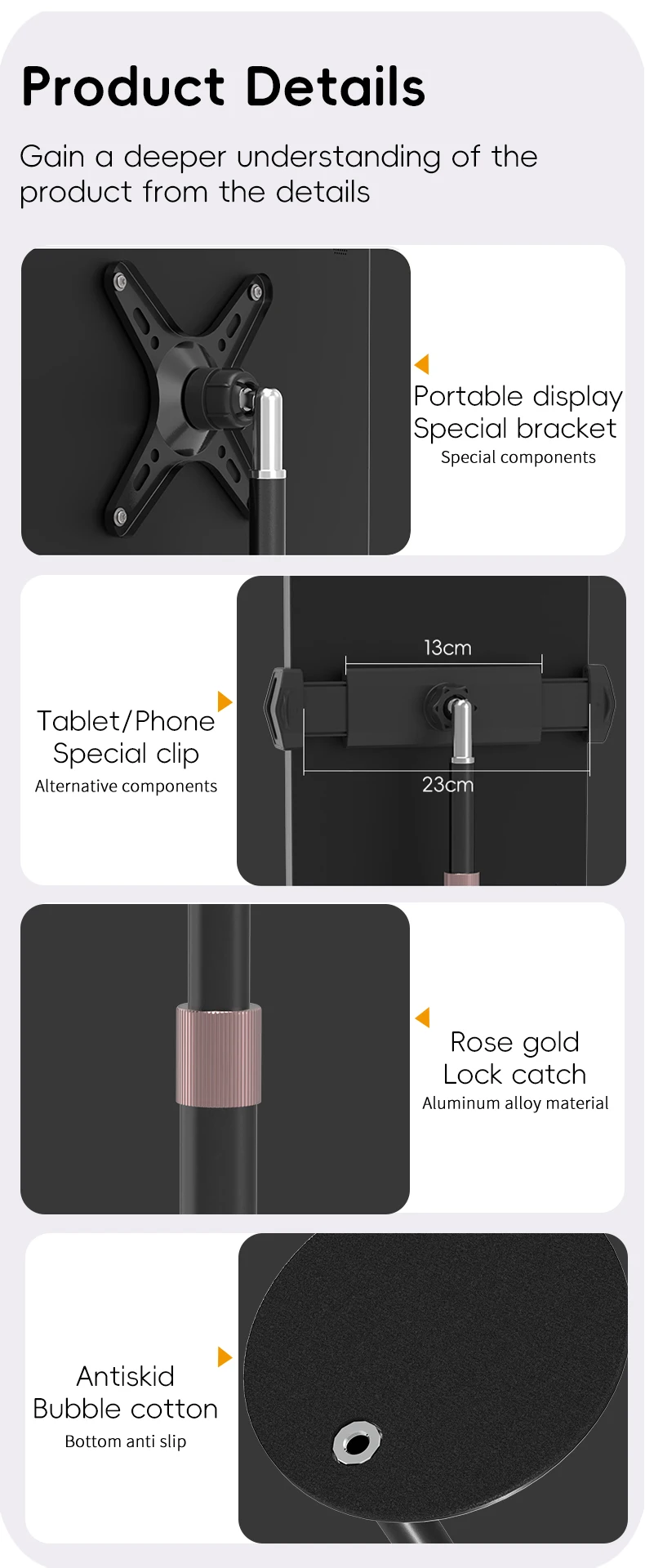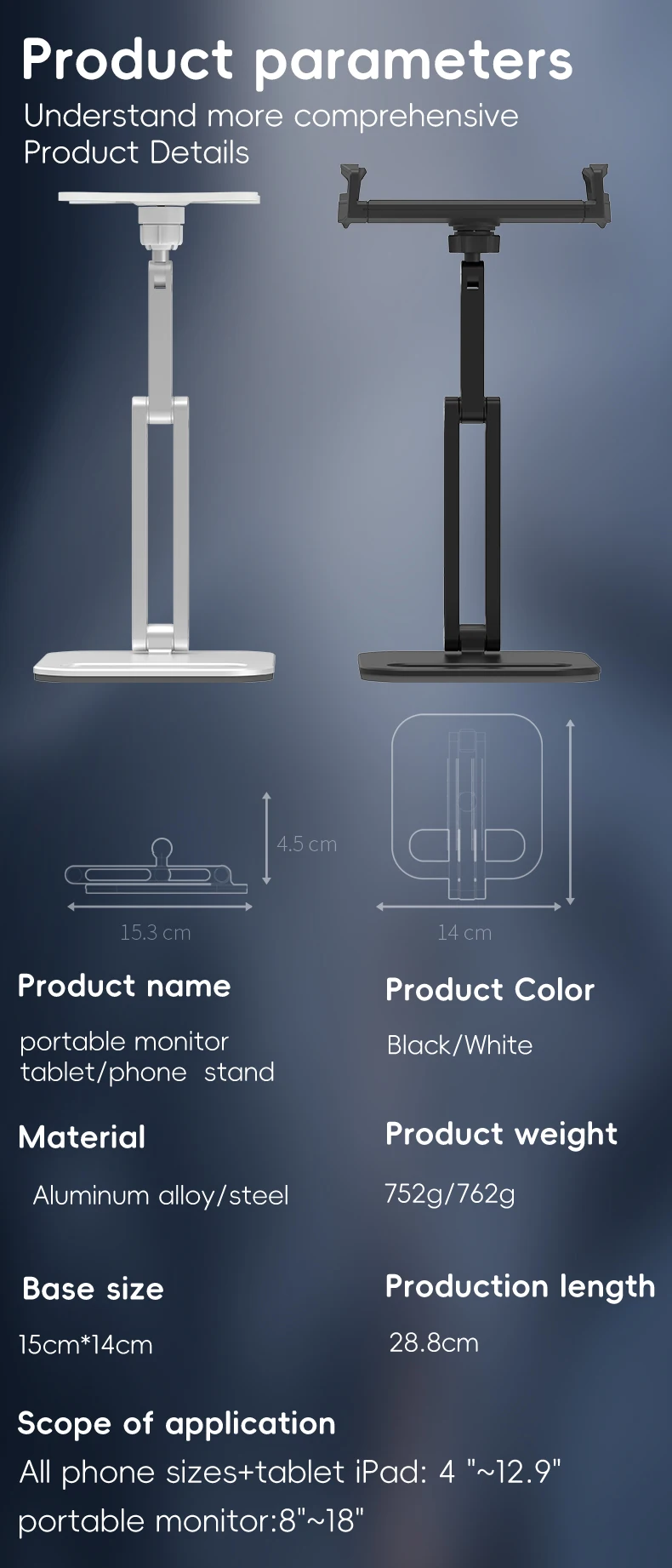 The portable monitor stand 18.5’’ is equipped with upgraded base,7.87’’ in Diameter,which is much longer than others’ 5.9’’,the ABS plastic clamp that holds your monitor more securely. Also can easily to adjust the tablet screen to any viewing angle you want.